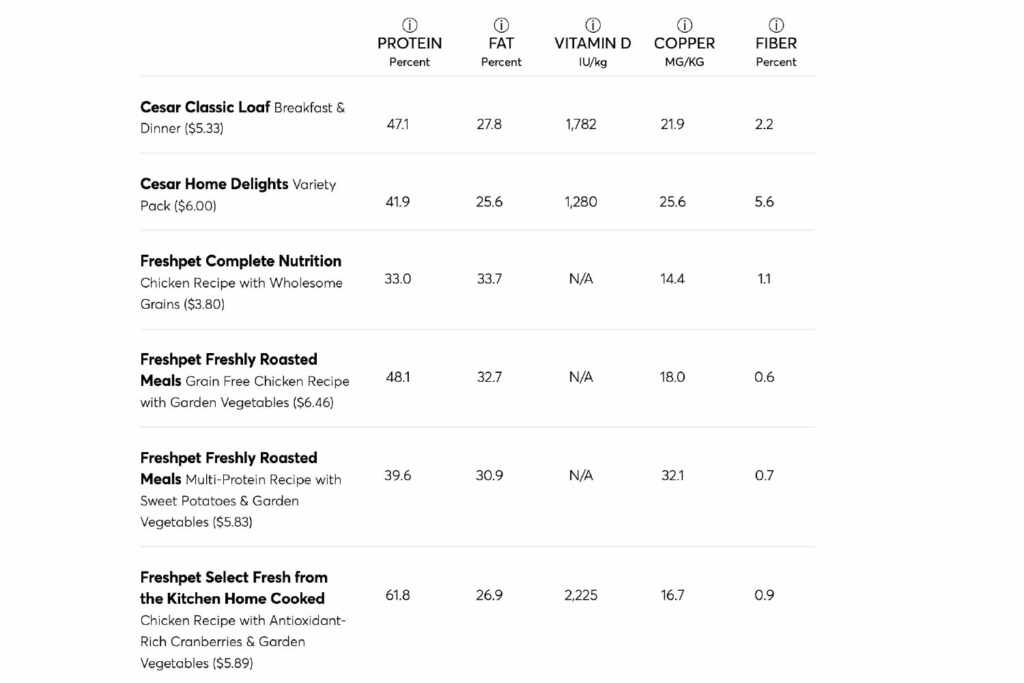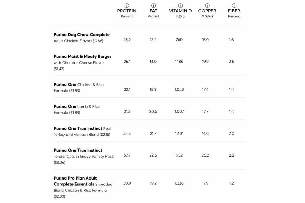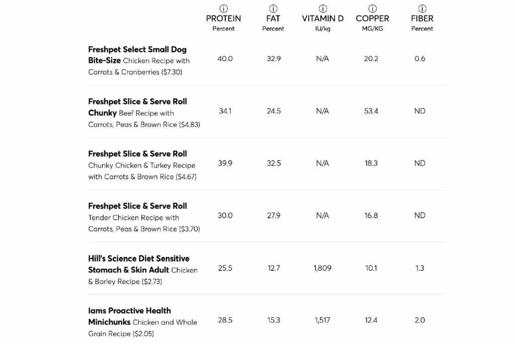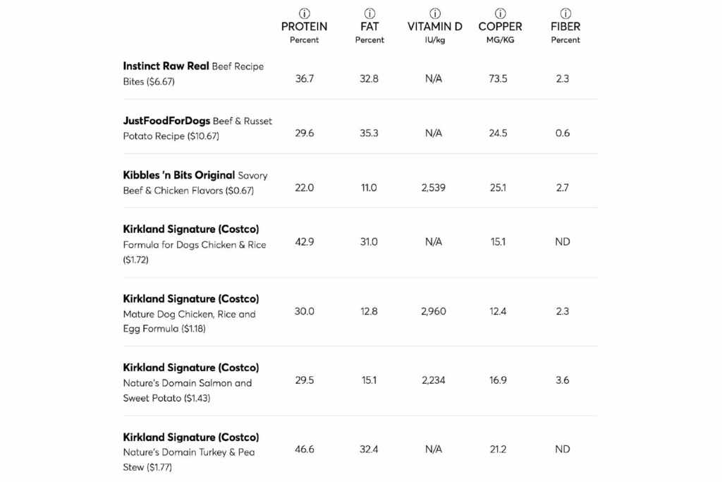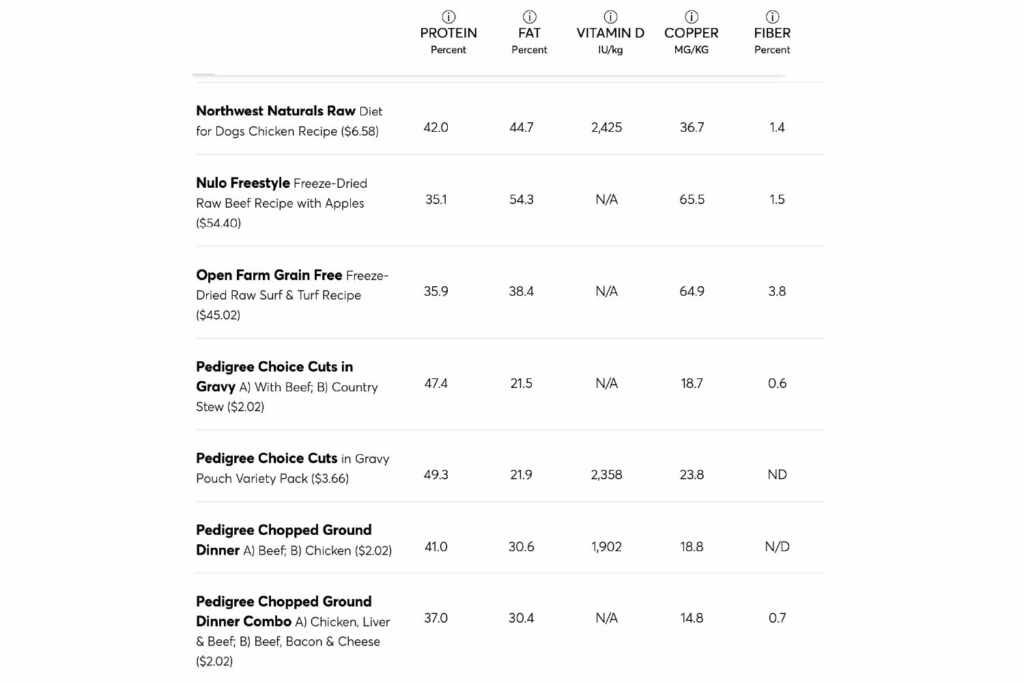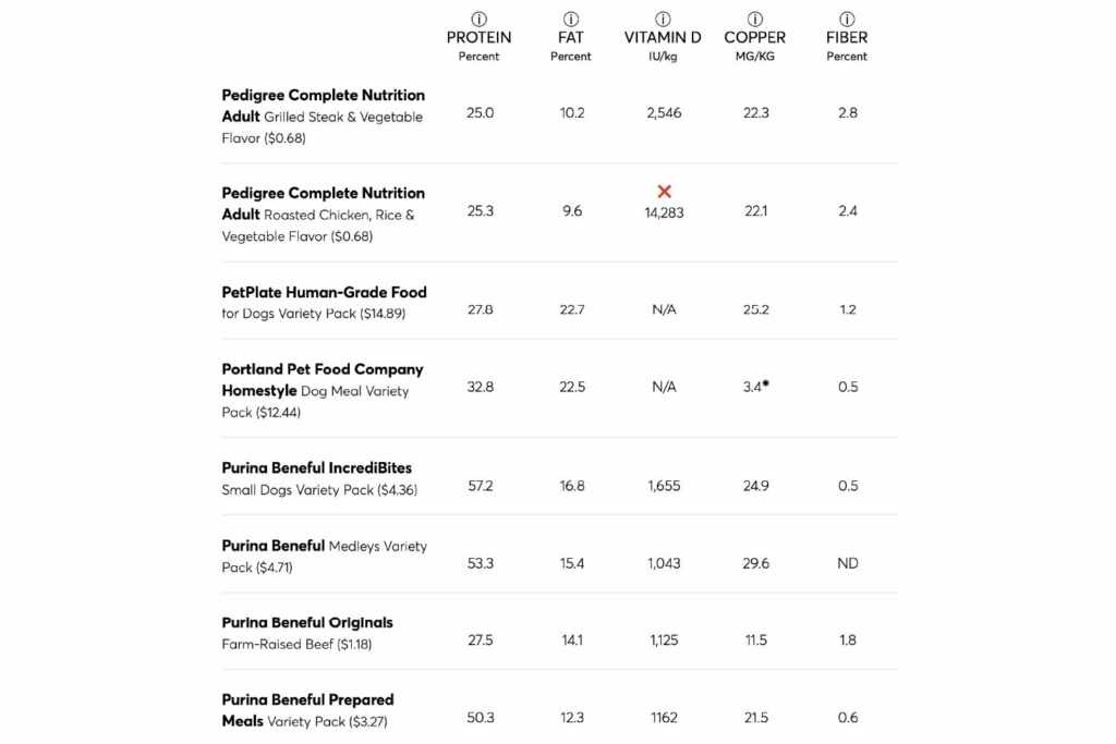 The table below shows the results of the CR tests for proteins, fats, vitamin D and copper. The foods that did not respect the AAFCO nutritional guidelines were marked with a red X. The results for fiber have been included, although there is no recommended level for this nourishing, although listed on dog food labels. The foods were tested for vitamin D only if this nutrient was indicated on the label; Otherwise, the column of vitamin D reports “N/A” (not applicable).