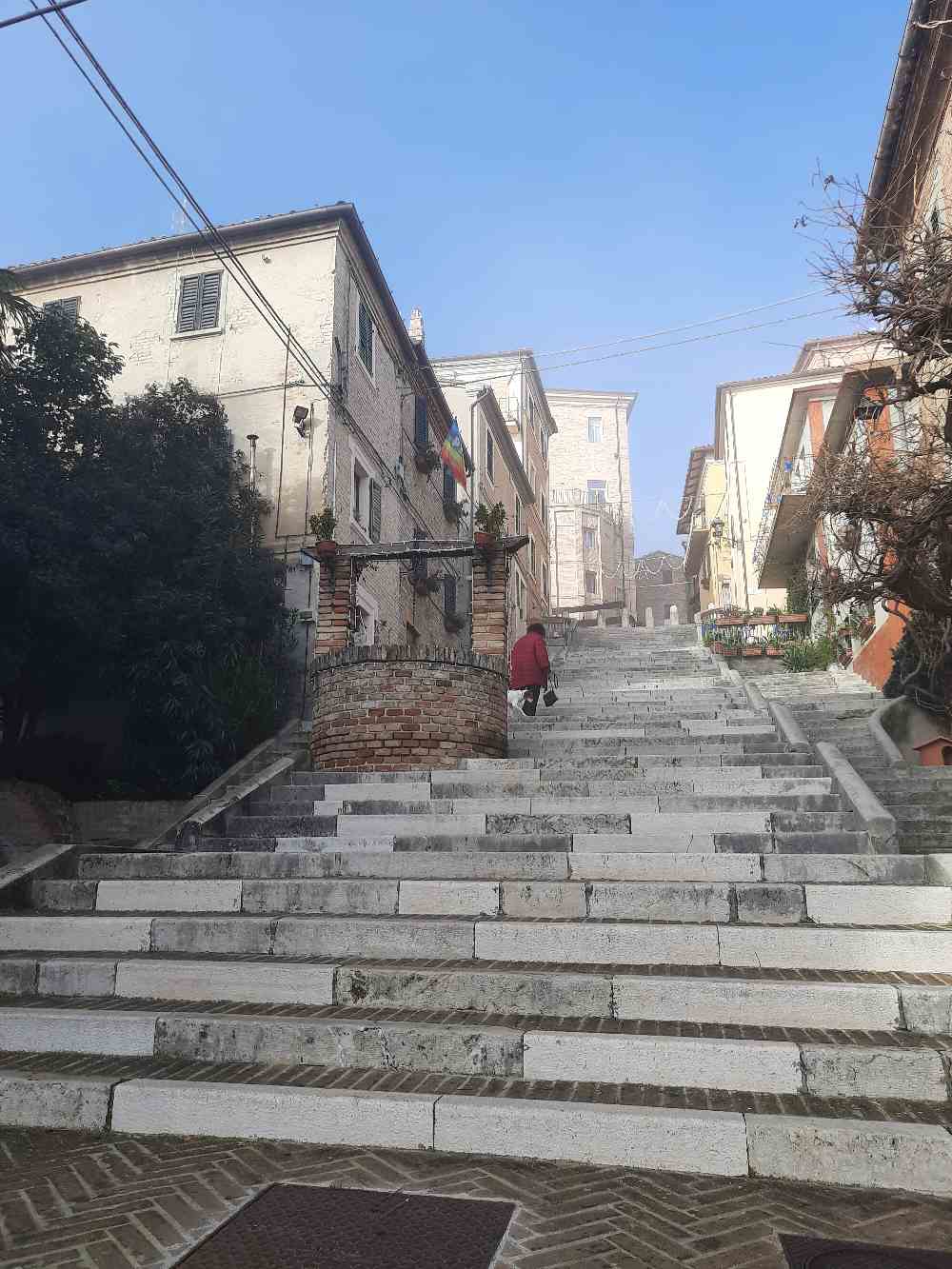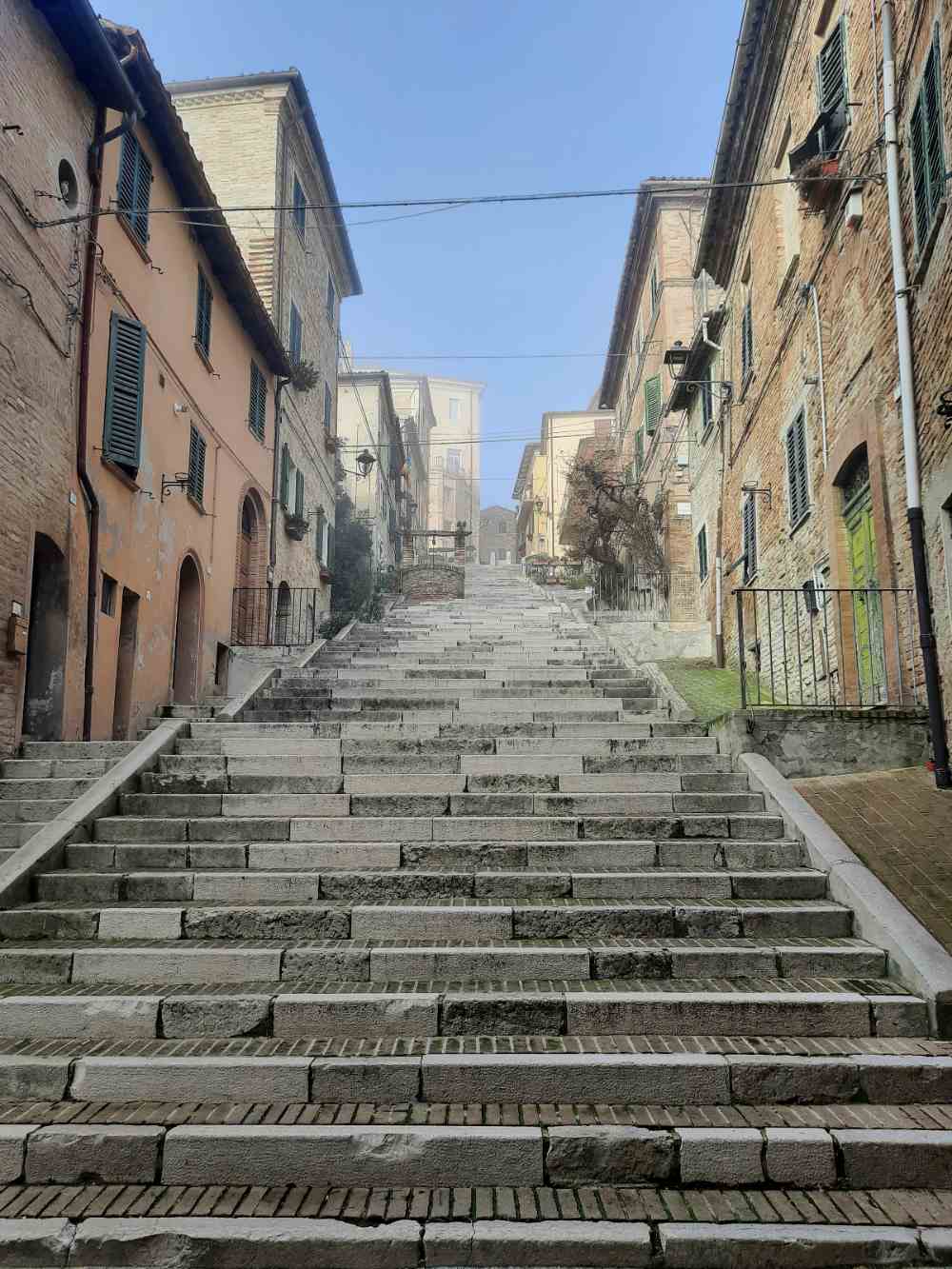 Entering from the western side, we followed the course of the streets which went from narrow to gradually more regular, until we came across the Piaggia, the symbolic staircase of the town. A staircase that seems infinite and cuts the village in two, making it unique. Precisely for this reason Corinaldo is renamed the town of a hundred stairs.