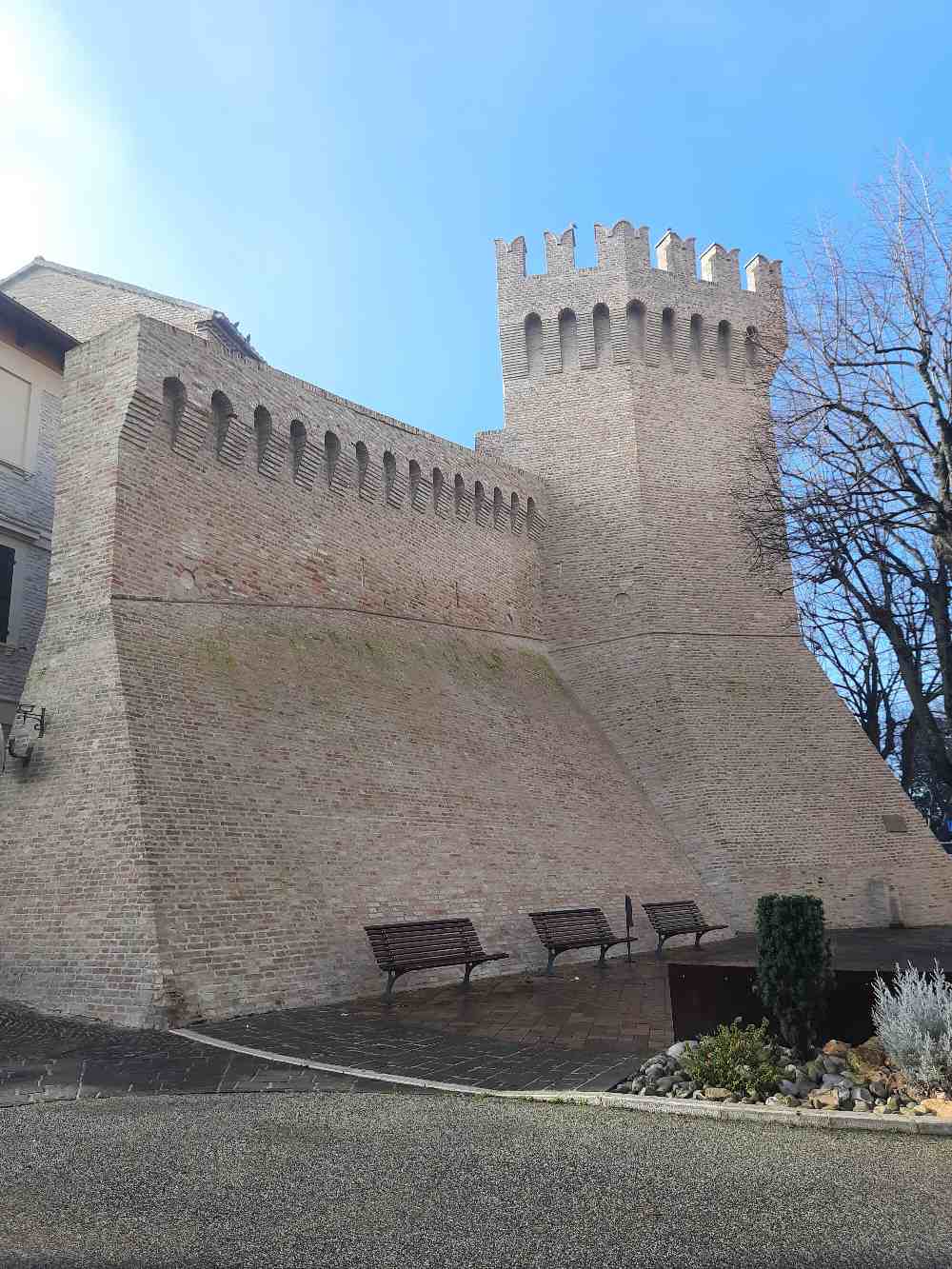 We visited Corinaldo, in the province of Ancona, one of those villages that don’t need special effects to impress. Here everything passes through the fifteenth-century walls, compact and continuous, which surround the historic center for almost a kilometre. Bastions, towers, fortified gates and the crenellated spur attributed to Francesco di Giorgio Martini tell a military story that is still legible, without tourist forcing. It is no coincidence that the village is recognized with the Orange Flag of the Italian Touring Club and is included among the most beautiful villages in Italy.