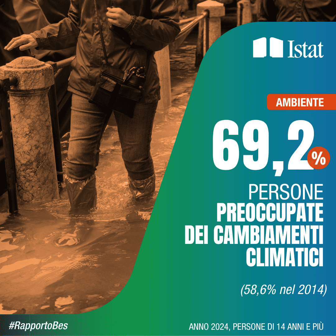 Concern about climate change has grown: 69.2% of Italians consider it a priority, compared to 58.6% in 2014, with significant increases among those over 74 and graduates (75.5%).